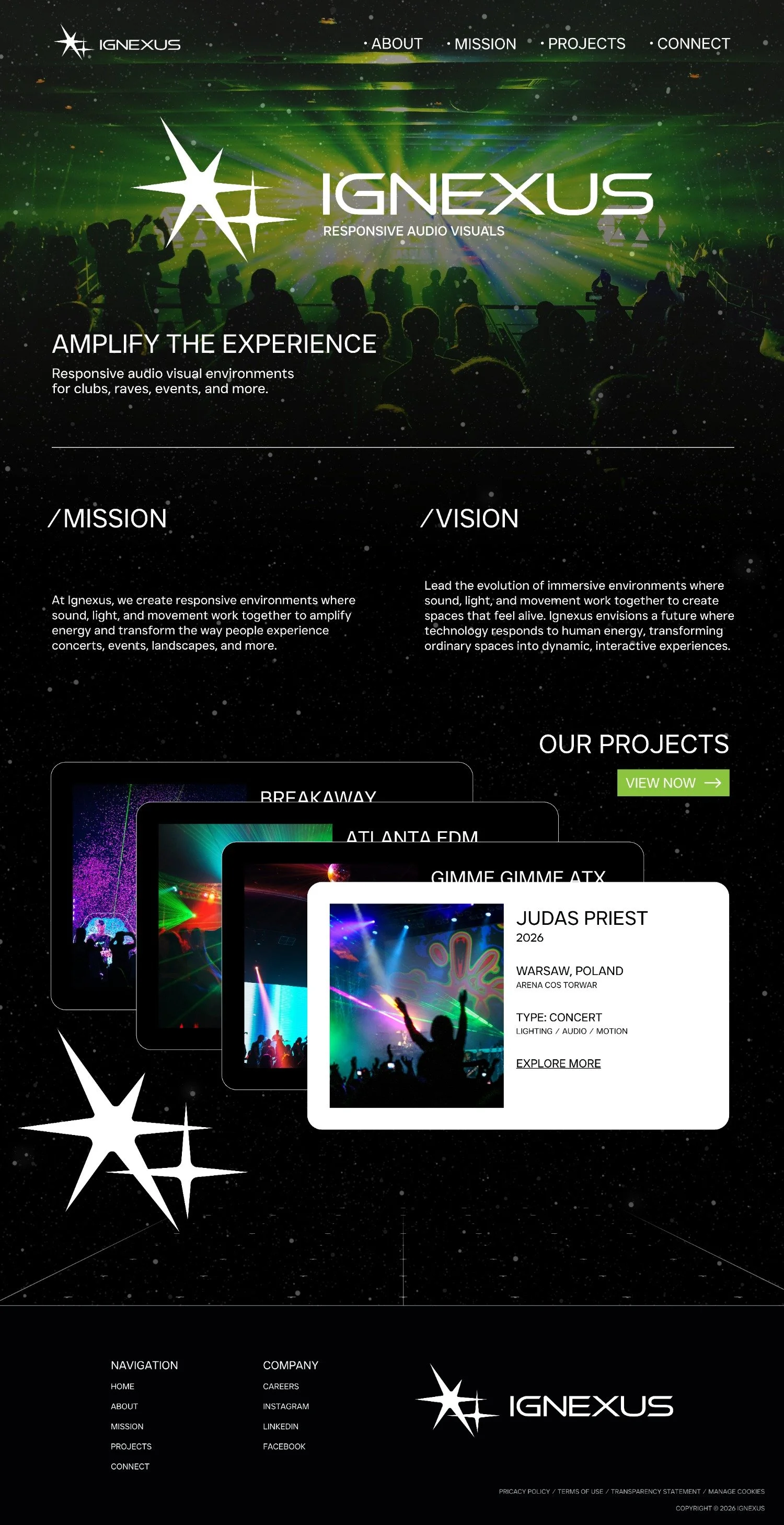 Ignexus is a global audio-visual studio that designs responsive environments for concerts, raves, events, bars, and immersive spaces. Through sound, light, and motion-driven technology, Ignexus transforms venues into dynamic environments that respond to the energy of the crowd.